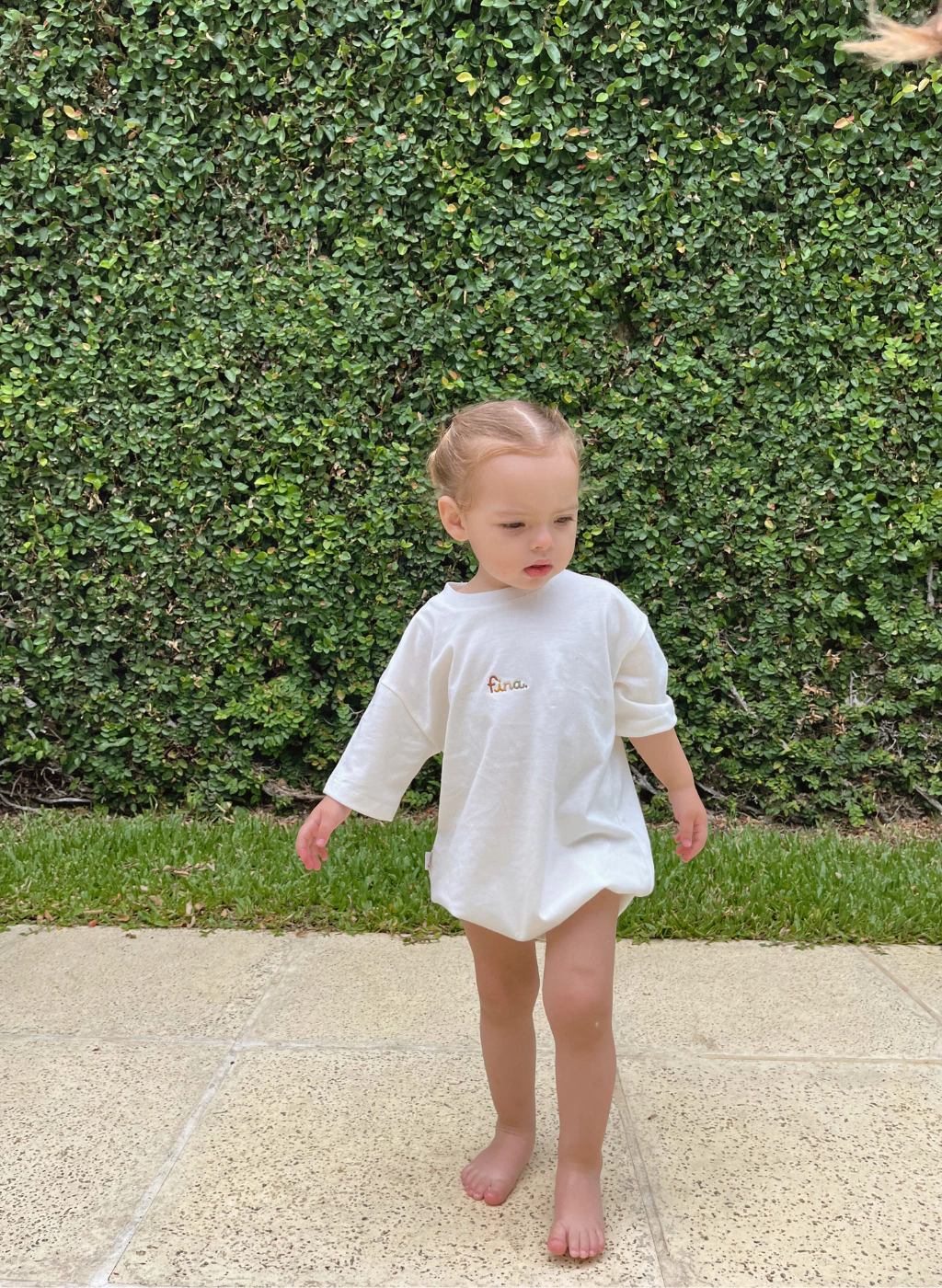Body manga corta de calce oversize, con cuello redondo de rib y broches snaps (a presión) importados en entrepiernas. En las piernas posee elásticos suaves que se ajustan sin apretar.